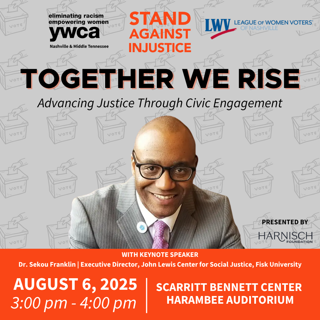 YWCA, in partnership with the League of Women Voters of Nashville (LWV), will host the annual Stand Against Injustice Rally at the Scarritt Bennett Center's Harambee Auditorium. This powerful, community-centered event commemorates the 60th anniversary of the Voting Rights Act of 1965 (VRA), a cornerstone of American democracy that expanded access to the ballot box for millions.
